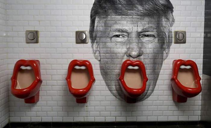 Anonymous. A further excremental vision, Trump, lips agape, as a receptacle for piss. This one carries the vulgar into a participatory act. Wonder how its users feel?